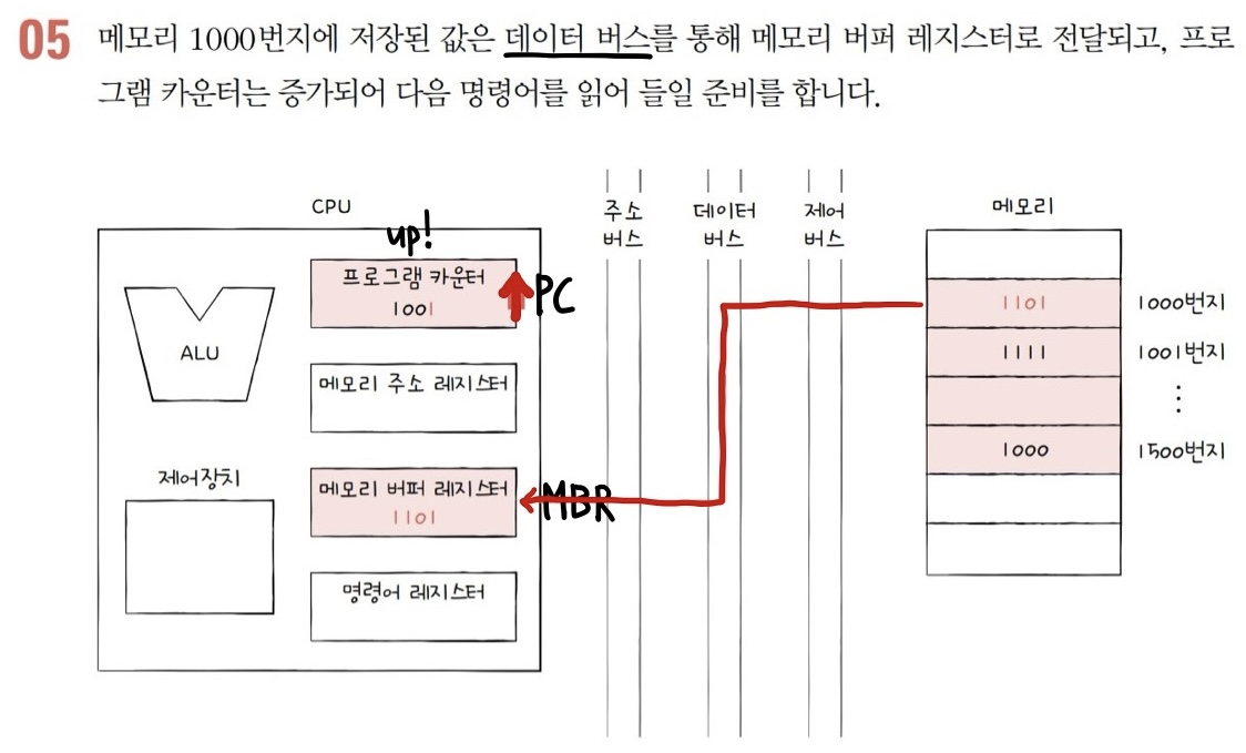 4. 메모리 버퍼 레지스터(MBR): 메모리와 주고 받을 데이터와 명령어 저장
