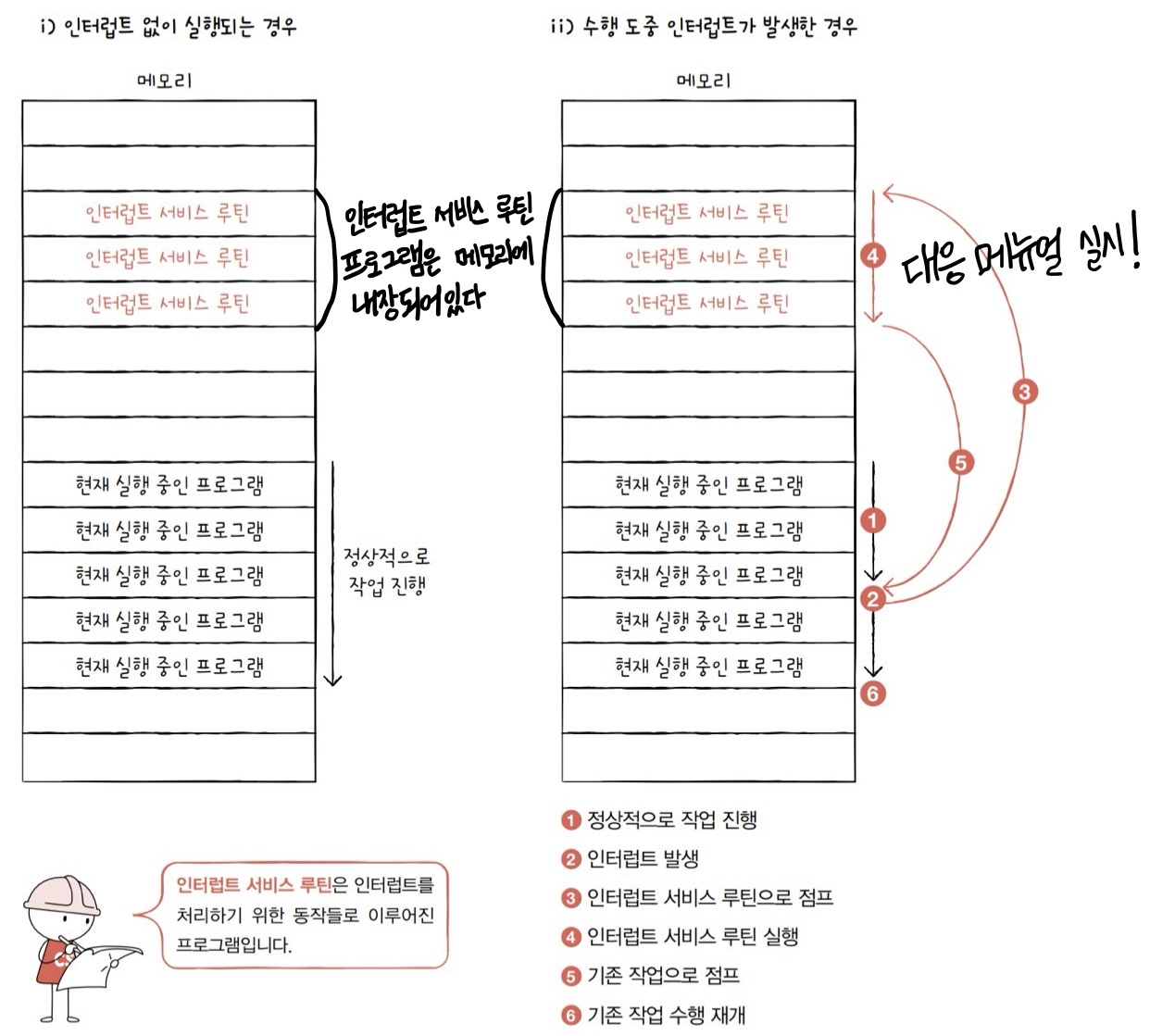 5. CPU는 인터럽트 벡터를 참조하여 인터럽트 서비스 루틴(ISR)을 실행한다