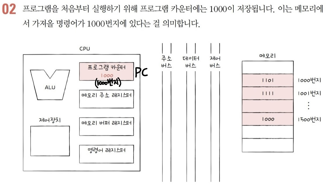 프로그램 카운터(PC)값이 증가하고 1000번지 명령어 처리가 끝나면 CPU는 다음 명령어(1001번지)를 읽어 들인다