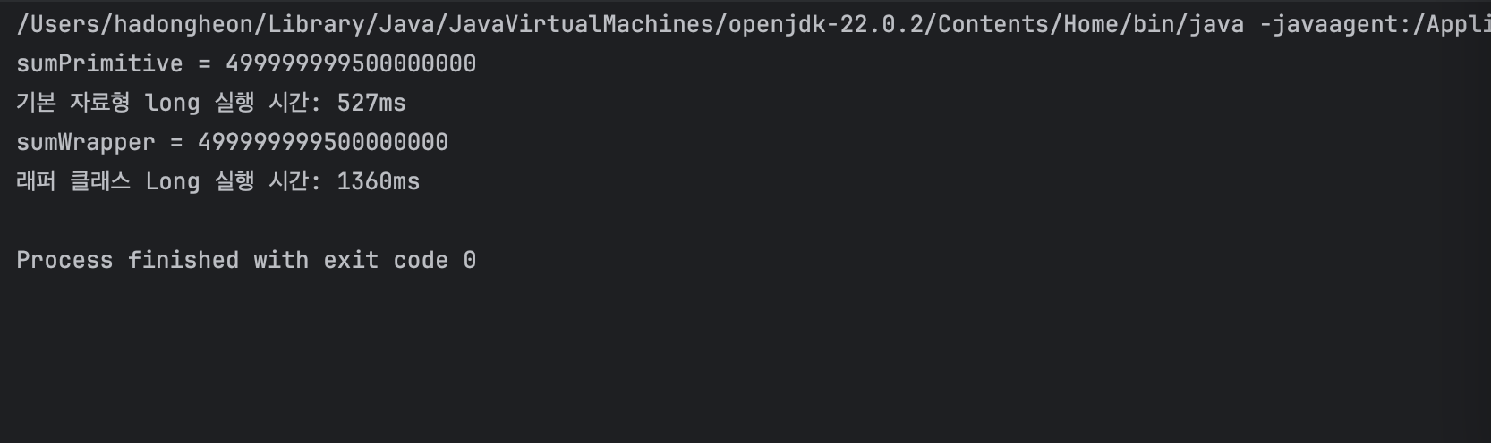 System.out.println("래퍼 클래스 Long 실행 시간: " + (endTime - startTime) + "ms");