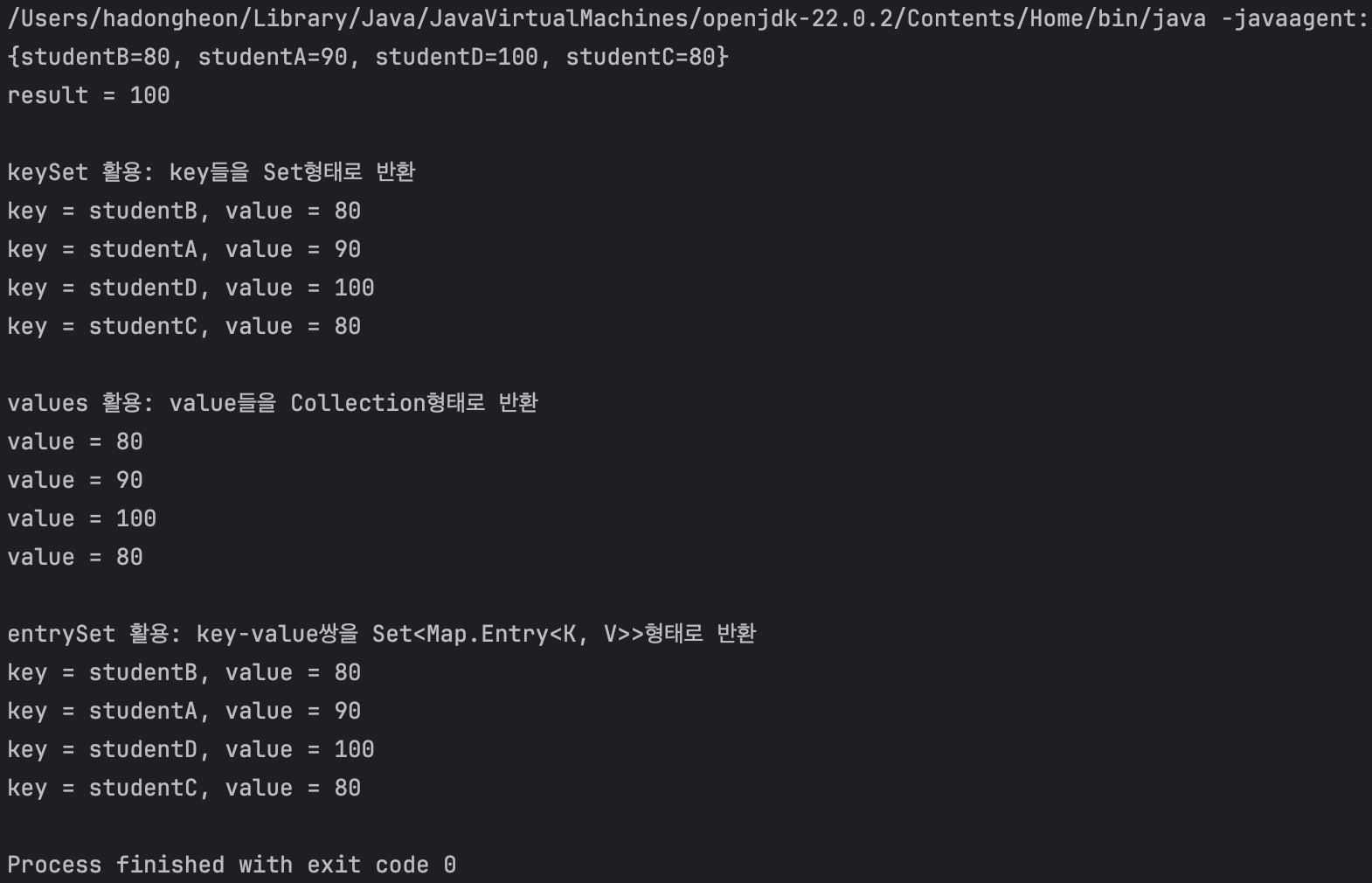 System.out.println("keySet 활용: key들을 Set형태로 반환");