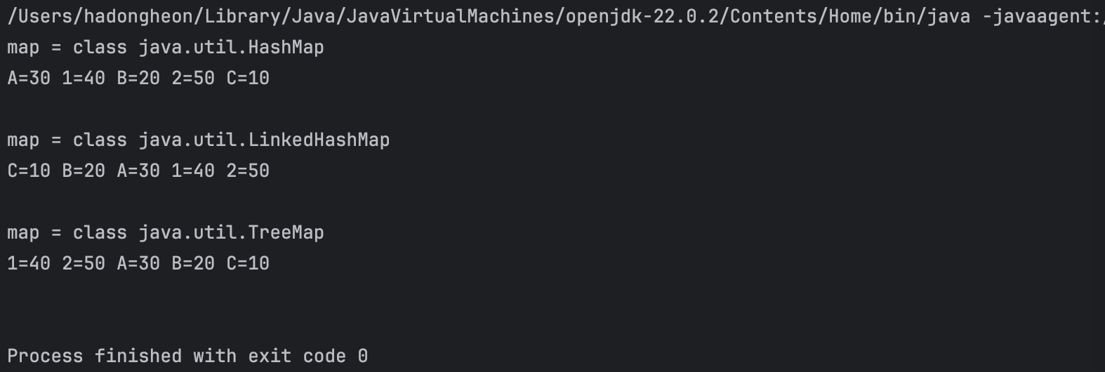 run(new LinkedHashMap<>()); // 순서 O, key: 중복 X / value: 중복 O