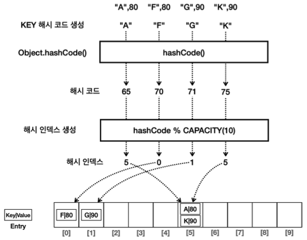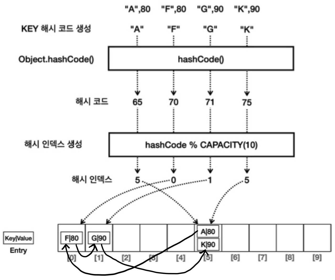 이렇게 해시를 사용해서 키와 값을 저장하는 자료구조를 일반적으로 해시테이블이라 한다. 앞서 학습한 HashSet은 해시테이블의 주요 원리를 사용하지만, 키-값 저장 방식 대신 키만 저장하는 특수한 형태의 해시 테이블로 이해하면 된다.