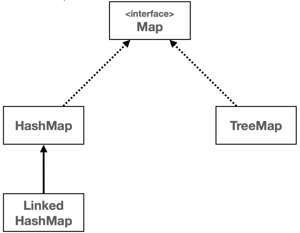 Map은 인터페이스이기 때문에, 직접 인스턴스를 생성할 수는 없다. 대신 HashMap(순서 X, key: 중복 X / value: 중복 O), LinkedHashMap(순서 O, key: 중복 X / value: 중복 O), TreeMap(순서 - key 기준 정렬, key: 중복 X / value: 중복 O) 등의 여러 구현 클래스를 가지고 있으며, 각 클래스는 Map 인터페이스를 구현하며 각각의 특성을 갖고 있다.