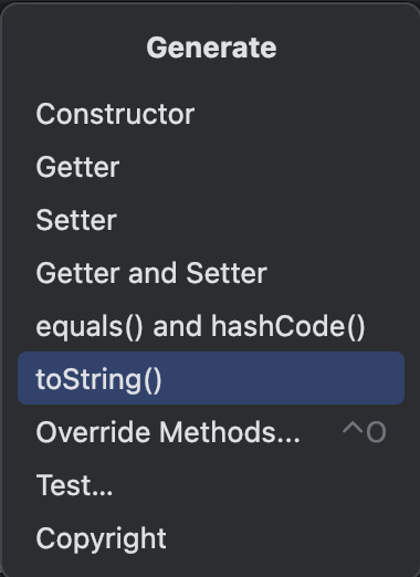 실무에서 toString()의 재정의가 필요한 상황이 온다면 IDE를 이용해서 편리하게 생성하도록 하자