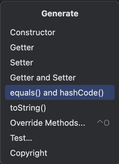 이 5가지를 모두 다 외울 필요는 없다. 실무에서 equals의 재정의가 필요한 상황이 온다면 IDE를 이용해서 편리하게 생성하도록 하자!