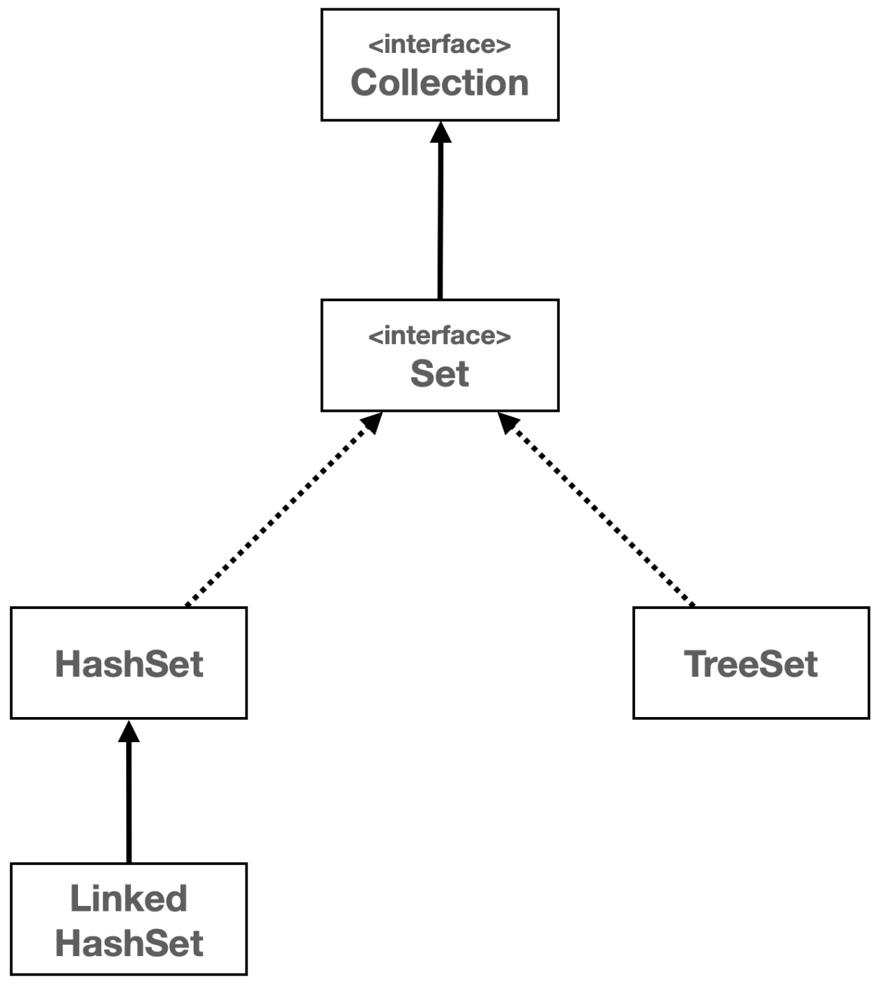 Set 인터페이스는 HashSet(순서 X, 중복 X), LinkedHashSet(순서 O, 중복 X), TreeSet(순서 - 정렬, 중복 X) 등의 여러 구현 클래스를 가지고 있으며, 각 클래스는 Set 인터페이스를 구현하며 각각의 특성을 가지고 있다.