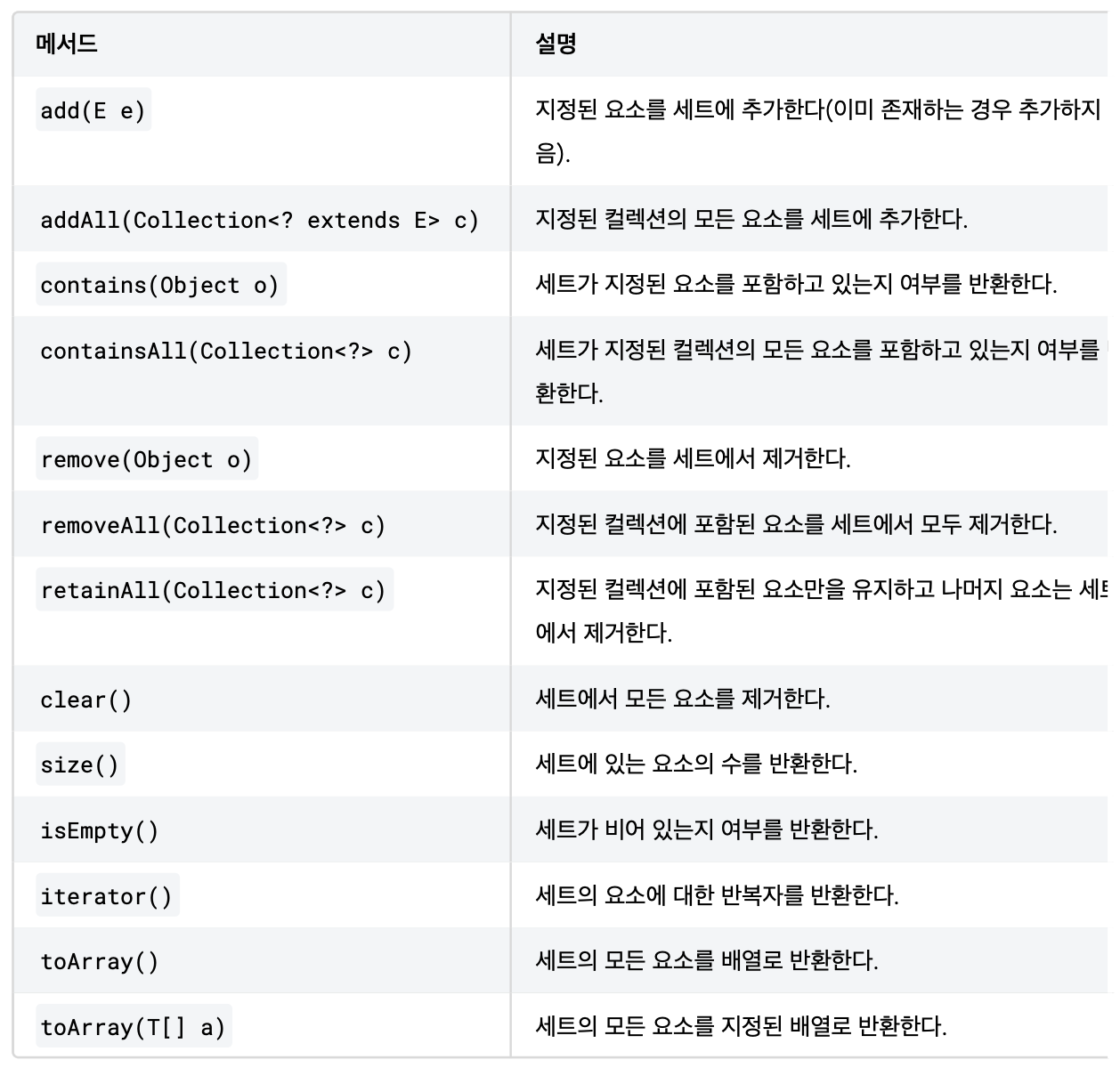 실무에서는 Set이 필요한 경우 HashSet을 가장 많이 사용한다. 그리고 입력 순서 유지, 값 정렬 필요에 따라서 LinkedHashSet, TreeSet을 선택하면 된다.